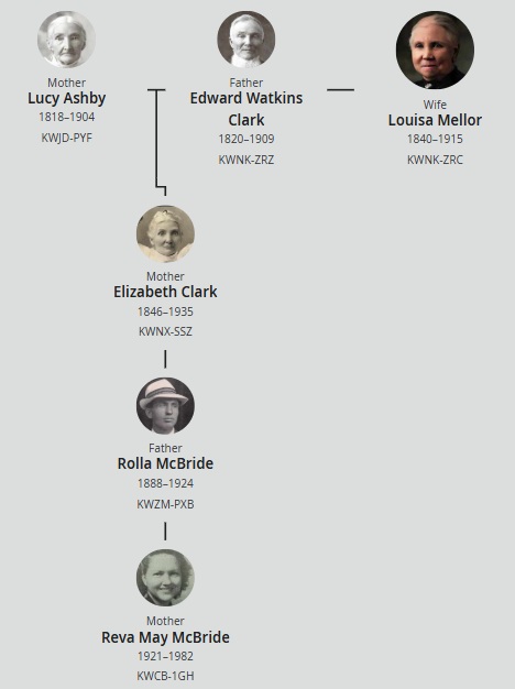 Who is Louisa Mellor in relation to my family and me? Louisa is the 2nd plural wife of Edward Watkins Cark and the daughter of James Mellor and his wife Mary Ann Payne. Edward Watkins Clark is my 3rd great-grandfather on my maternal side of the family tree. He is the great-grandfather of my grandmother, Reva May McBride.